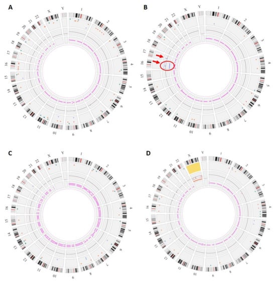 Genomic anomalies identified by OGM. The circos plot is composed of the following layers (from outside to inside): cytoband location, color-coded SV dots, copy-number changes, and variant allele frequency (VAF). In the center of the plot, translocations are shown as lines connecting the genomic loci involved. (A) Fetus #1: OGM did not show any copy-number changes or chromosome number abnormalities but detected many SVs (64) (B) Fetus #12: Circos plot showed a trisomy 16 (surrounded, fractional copy number: 2.929) and a gain on chromosome 17 at the copy-number changes layer (arrow, VAF: 0.474, Confidence score of 1). (C) Fetus #13: Circos plot showed a VAF split for all chromosomes corresponding to a triploidy (VAF~0.33 and 0.66). (D) Fetus #14: Circos plot showed a monosomy X (fractional copy number: 1.029).