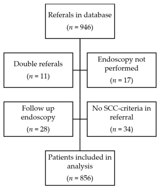 A total of 946 gastroscopy referrals, according to the SCC-EGC, were identified between 1 March 2017 and 28 February 2021. After the exclusion of non-eligible referrals (see Figure 1), 856 unique gastroscopy referrals remained for analysis.