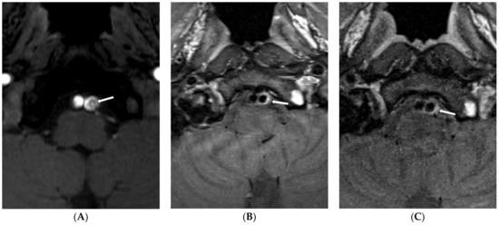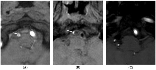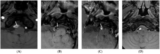 - Choi, J.W.; Han, M.; Hong, J.M.; Lee, J.S.; Kim, S.Y.; Kim, S.S. Feasibility of improved motion-sensitized driven-equilibrium (iMSDE) prepared 3D T1-weighted imaging in the diagnosis of vertebrobasilar artery dissection. J. Neuroradiol. 2018, 45, 186–191. [Google Scholar] [CrossRef]