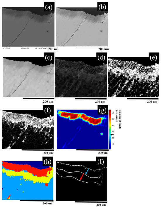 SEM segmentation of demineralized enamel: (a) raw SEM selected frame of demineralized enamel at 500×, (b) after intensity normalization and background removal, (c) after applying morphological disk filter, (d) after subtracting frame (c) from frame (b), (e) binary image conversion of frame (d). The filtered area corresponding to Intra-prismatic and Inter-prismatic enamel with sample cracks, (f) after Sobel edge detection, (g) after applying kernel of size (10 × 10) to count the number of pixels per kernel (color bar) with an auto-selected quantized intensity threshold. Intra-prismatic zone can be recognized by the area that has a number of pixels above 25 pixels per kernel indicated by the black arrow on color bar, (h) final segmented SEM frame with red color label red for Intra-prismatic zone, yellow for Inte-r prismatic zone, light blue for sound (healthy) tissue, and dark blue for the background. (I) Enamel surface and two interfaces, one between Intra-prismatic and Inter-prismatic zones, and other interface between Inter-prismatic zone and sound tissue. The blue arrow indicates the normal thickness between the surface and Intra-prismatic/Inter-prismatic interface, and the red arrow indicates the normal thickness between the Intra-prismatic/Inter-prismatic interface and Inter-prismatic/sound interface.