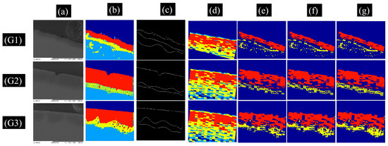 OCT/SEM frame correlation maps for a test sample with three ROIs (G1, G2, and G3). (a) Raw SEM images. (b) Segmented SEM (red:Intra-prismatic zone, yellow: Inter-prismatic zone, light blue: sound or healthy tissue, and dark blue: background). (c) Enamel surface and interfaces of Intra-prismatic and Inter-prismatic zones extracted from segmented SEM frame. (d) OCT-corresponding frames with a selected color map and segmented labels (red:Intra-prismatic zone, yellow: Inter-prismatic zone, light blue: sound or healthy tissue, and dark blue: background or the intensity below the colormap threshold). (e–g) Correlation results with three slightly different trail color maps (red: successive correlation at Intra-prismatic zone, yellow: successive correlation at Inter-prismatic zone, dark blue: sound or healthy tissue and background above the enamel surface). Column (g) is the best correlation by a selected color map on column (d).