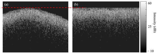 Enamel surface alignment. (a) Original B-scan showing surface curvature and (b) the same B-scan in (a) after enamel surface alignment to an axial level corresponding to the highest axial point (dashed red line) of the original enamel surface.