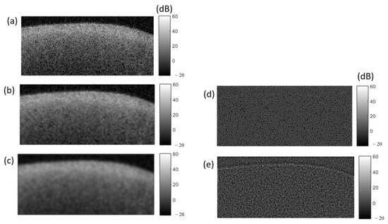 Subtraction of speckle noise in OCT. (a) Original B-scan of demineralized enamel via SANTEC (SS-OCT). (b) After applying MATLAB median filter. (c) After applying MATLAB Wiener filter. (d) Speckle noise extracted by subtracting median filter image (b) from the original image (a); (e) speckle noise extracted by subtracting Wiener filter image (c) from image (a).