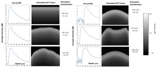 Examples of different simulated OCT line profiles and B-scans of demineralized enamel before adding extracted speckle noise for code validation. For A-scan simulation, (RA_line): real average A-scan; (LS_line): least-square-fit A-scan; and (MA_line): mathematical approach A-scan. For tooth surface curvature simulation, (F_sur): flat tooth surface; (S_sur): same surface as a selected real B-scan frame; (M_sur): mathematical equation surface; and (D_sur): freehand drawing surface.