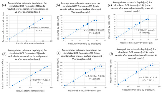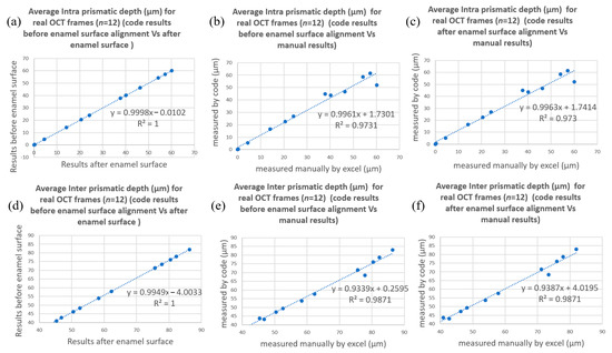 Figure 9 and Figure 10 show the correlation trendlines of the mean demineralization depth for simulated and real OCT frames, respectively. A strong correlation was found between the average demineralization depth resulting from the suggested code before the enamel surface alignment and the average demineralization depth resulting from the suggested code after the enamel surface alignment; the values of were calculated as 1 for each zone at the simulated and real OCT frames, as shown in Figure 9a,d and Figure 10a,d.