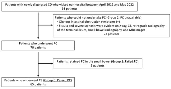 This retrospective study included 93 patients with newly diagnosed CD who visited the Hirosaki University Hospital between April 2012 and May 2022. In patients who had no obvious luminal stenosis on radiological examinations (e.g., abdominal X-ray inspection, computed tomography, retrograde radiography of the terminal ileum, small-bowel radiography, etc.), small-bowel patency was confirmed using patency capsules (PC; Medtronic, Minneapolis, MN, USA) before the capsule endoscopy (CE) procedure. PillCamTMSB3 (Medtronic) was used in all adaptive patients. Regarding small-bowel patency, patients were classified into three groups: those who were able to confirm the small-bowel patency using PC (Group 0: passed PC), those who had no obvious luminal stenosis on a radiological examination but had a retained PC in the small bowel (Group 1: failed PC), and those with obvious luminal stenosis on a radiological examination (Group 2: PC unavailable) (Figure 1). Table 1 and Table S1 show the patient characteristics.