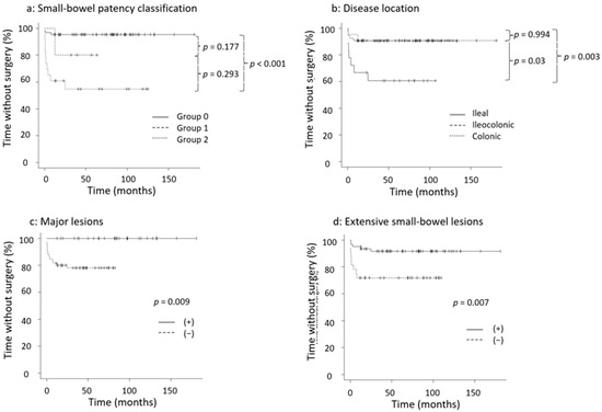Kaplan–Meier analysis of survival without surgery based on four factors (small-bowel patency classification, disease location, major lesions, and extensive small-bowel lesions) is shown in Figure 2. In the 14 patients who underwent surgery, the median time from diagnosis to surgery was 40 days, and 12 patients required surgery within 1 year of diagnosis. The log-rank test was used to evaluate the time to surgery for each factor, which was significant in predicting the risk of surgery: between Groups 0 and 2 of the small-bowel patency classification (p < 0.001), between ileal and colonic types (p = 0.003), major lesions (p = 0.009), and extensive small-bowel lesions (p = 0.007) (Figure 2).
