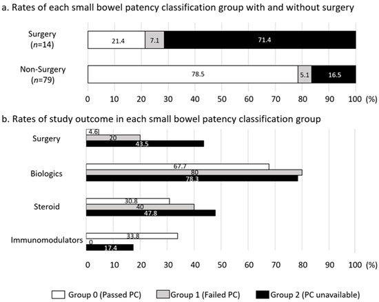 Figure 4 presents the rates of each small-bowel patency classification group with or without surgery and the study outcome. The group of patients with surgery had higher rates of Groups 2 (PC unavailable) and 1 (failed PC) compared to the patients without surgery group (Figure 4a). As shown in Figure 4b, Groups 1 and 2 had higher rates of surgery and utilization of BIOs and steroids when compared to Group 0. Group 0 had higher rates of IM utilization compared to Groups 1 and 2, contrary to the lower rates of surgery and BIOs and steroid utilization. These results show that Group 0 patients tended to use IMs alone without both of BIOs and steroids.
