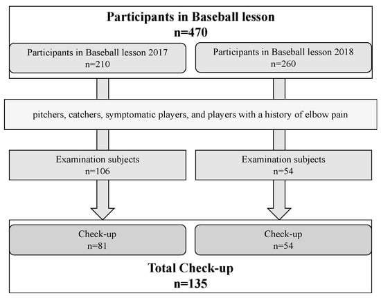 The study involved 160 subjects, including pitchers, catchers, players showing symptoms of elbow pain, and players with a previous history of elbow pain from a total of 470 baseball players of elementary school students (50 teams in total) who participated in youth baseball lessons organized by the prefectural high school baseball federation over a two-year period from 2017 to 2018 (Figure 1). None of the players had a medical check-up two years in a row.
