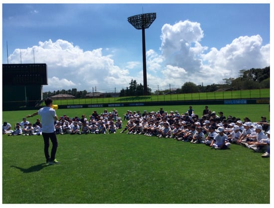 - Iwame, T.; Matsuura, T.; Suzue, N.; Kashiwaguchi, S.; Iwase, T.; Fukuta, S.; Hamada, D.; Goto, T.; Tsutsui, T.; Wada, K.; et al. Outcome of an Elbow Check-up System for Child and Adolescent Baseball Players. J. Med. Invest. 2016, 63, 171–174. [Google Scholar] [CrossRef]
