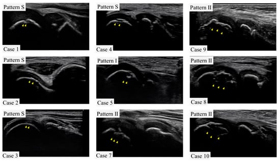 First, the subjects were given a medical questionnaire in which they were asked to provide their name, team, position, and history of elbow pain. Physiotherapists and trainers then assessed the elbow for pain, limited motion, tenderness of the medial epicondyle, tenderness of the humeroulnar or humeroradial joint, tenderness of the olecranon, and instability with valgus stress tests at 30 degrees, 60 degrees, and 90 degrees of elbow flexion for both the throwing and non-throwing sides. The elbow joint was then examined by a physician using ultrasound to confirm the presence of OCD; the Okada’s pattern classification was used to assess OCD [15] (Figure 2). The ultrasound examination focused solely on the lateral side of the elbow, checking both the short axis and the long axis. The equipment used for the ultrasound examination was a portable ultrasonography and an 11-MHz linear array transducer (SONIMAGE MX1, KONICA MINOLTA JAPAN Inc., Tokyo, Japan). The ultrasound examinations were performed by orthopedic surgeons with 3–10 years of experience. For the final analysis, the ultrasound images were interpreted by multiple physicians, including a specialist with over 20 years of experience in orthopedics. In this study, following the pattern classification, those with marginal irregularities were extracted, and the pattern S, which is typically not counted as OCD in a single examination, was also included as OCD for the purposes of this screening.