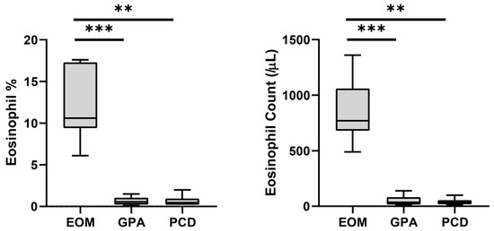Peripheral blood eosinophil concentration and count of each disease group. Bars and error bars indicate median and range, respectively. Grey box indicates interquartile range. The Kruskal–Wallis test and Dunn’s multiple comparisons test were used for statistical analysis. (EOM: eosinophilic otitis media; GPA: granulomatosis with polyangiitis; PCD: primary ciliary dyskinesia; ***: p < 0.001; **: p < 0.01.)