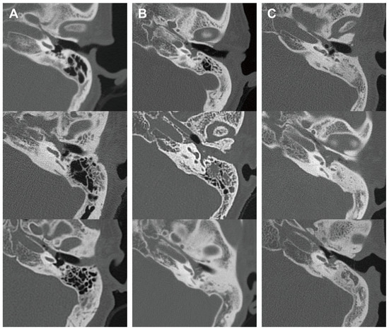 Patients were scanned using a Siemens SOMATOM Force multidetector scanner (Definition Flash, Siemens Healthcare, Forcheim, Germany) with identical settings. Routine protocols of temporal bone CT scans were as follows: axial plane, matrix = 512 × 512, voxel size = 0.4043 × 0.4043 × 0.5000 mm3, 96 slices.