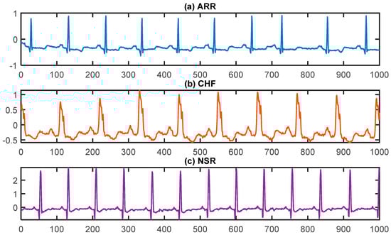 Plots of ECG signals for (a) cardiac arrhythmia (ARR), (b) congestive heart failure (CHF), and (c) normal sinus rhythm (NSR), respectively.