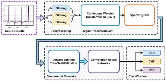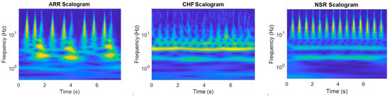 Pre-processing and signal transformation steps are applied to ECG signals in the databases to prepare them for training purposes. This paper explores the representation of ECG signals as scalograms. These scalogram images are obtained by applying the continuous wavelet transform to the ECG signals. This transformation allows for the extraction of time–frequency information from the signals, which can then be visualized as scalograms. These scalogram images provide a more comprehensive representation of the ECG signals, capturing both their temporal and spectral characteristics. Scalograms offer a better representation than the traditionally used spectrograms as they provide a more detailed and localized view of the signal’s frequency content over time. This can be particularly useful in analyzing ECG signals, as it allows for the identification of specific frequency components that may be indicative of certain cardiac conditions or abnormalities. Additionally, the use of scalograms can aid in the detection and classification of various signal artifacts or noise, enhancing the accuracy and reliability of ECG analysis.