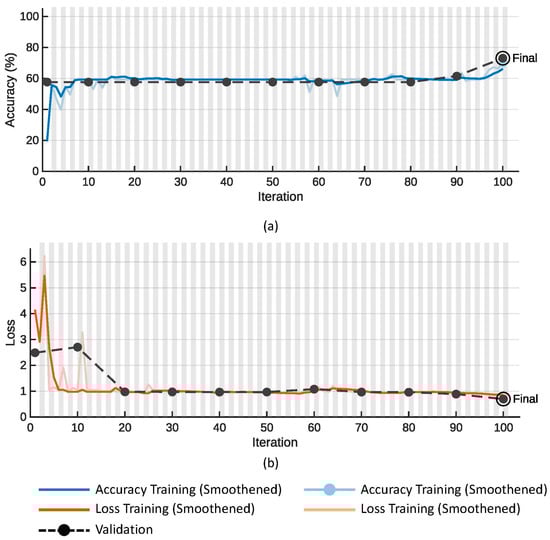 Figure 5 shows plots of the (a) accuracy and (b) loss function on the training (colored line) and validation data (dotted line with black markers) for the proposed SmallNet CNN model. Similarly, Figure 6 shows plots of the (a) accuracy and (b) loss function on the training (colored line) and validation data (dotted line with black markers) for the GoogLeNet model.