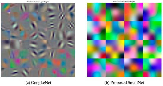 Visualization of activation patterns for first convolution layer weights in (a) GoogLeNet and (b) proposed SmallNet.