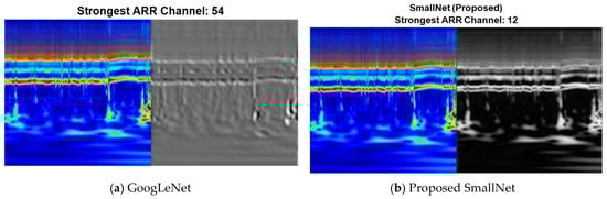 Comparing the strongest activation channel for classification in CNNs holds significance in unraveling how these networks prioritize and respond to different features during the classification process. In the context of ARR detection, CNNs often operate on multiple channels, each corresponding to specific visual characteristics. Identifying the strongest activation channel involves pinpointing the channel that exhibits the highest level of activation or response to features relevant to the classification task. Figure 9 shows the visualization of the strongest activation channels for ARR classification in the proposed SmallNet and GoogLeNet. This visualization is essential to elucidate which visual cues or patterns contribute most significantly to the network’s decision making.