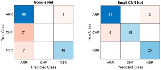 Figure 10 presents a comparison of the confusion matrices for the training dataset obtained from both the models considered in the present study. The confusion matrices for training data obtained from GoogLeNet and the proposed SmallNet revealed nuanced classification performance. GoogLeNet demonstrated strength in accurately classifying NSR instances, with 66 ARR and 18 NSR instances correctly identified. However, it exhibited challenges in distinguishing ARR and CHF instances, misclassifying 21 CHF instances as ARR. On the other hand, the proposed SmallNet showcased proficiency in correctly classifying ARR instances, with 65 instances accurately identified. While it misclassified two ARR instances as CHF and six CHF instances as ARR, it notably outperformed GoogLeNet in CHF classification. Additionally, the proposed SmallNet exceled in NSR classification, accurately identifying all 25 instances.