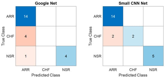 Similarly, the confusion matrices for the test dataset obtained from GoogLeNet and the proposed SmallNet are shown in Figure 11 and offer insights into their classification performance. The GoogLeNet confusion matrix shows that it accurately classified 14 instances of ARR and 4 instances of NSR. However, it struggled to differentiate CHF, misclassifying four CHF instances, potentially indicating challenges in distinguishing between CHF and other classes. The proposed SmallNet, on the other hand, demonstrated proficiency in ARR classification, with 14 instances accurately identified. It faced challenges in CHF classification, misclassifying two instances as ARR and two instances as NSR. Despite these challenges, it exceled in correctly classifying NSR instances, with five accurately identified.