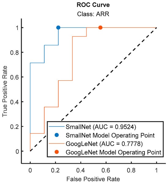 In Figure 13, the ROC curves for the proposed small CNN and GoogLeNet are visually compared specifically for the ARR class. The ROC curve illustrates the trade-off between the true-positive rate and false-positive rate across different classification thresholds. The accompanying AUC values provide a quantitative measure of the models’ discriminative performance. Notably, the ROC curve for the proposed small CNN showcased a superior AUC of 0.9524 for ARR detection, indicating a high level of accuracy in distinguishing between positive and negative instances of arrhythmia. In contrast, GoogLeNet exhibited a lower AUC value of 0.7778 for the same class, suggesting a less effective performance in ARR detection. This visual and numerical evidence confirms the enhanced performance offered by the proposed small CNN in accurately identifying instances of arrhythmia, reinforcing its potential as a robust model for cardiac classification tasks.