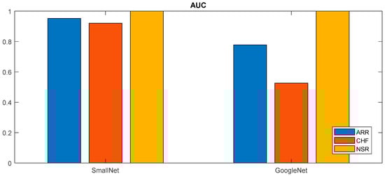 In Figure 14, a bar graph succinctly illustrates the AUC values for the proposed small CNN and GoogLeNet across different cardiac classes. The graph provides a visual representation of the discriminative performance of each model for ARR, CHF, and NSR. Notably, the proposed small CNN consistently exhibited higher AUC values for all classes—0.9524 for ARR, 0.9211 for CHF, and a perfect AUC of 1 for NSR. This graphical representation reinforces the quantitative findings, emphasizing the proposed small CNN’s superior classification performance across the diverse range of cardiac conditions compared to GoogLeNet.
