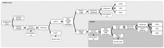 The model simulated one complete screening cycle which included the routine screen and early recall periods. ‘Routine screen’ included the invite to screen, sample collection, hrHPV testing, LBC/methylation, and colposcopy (where indicated). For those who were hrHPV-positive but LBC/methylation-negative at routine screen, the early recall period included sample collection, six-month early recall for LBC/DNA methylation testing, and colposcopy (where indicated). Longer-term costs and outcomes were not considered.