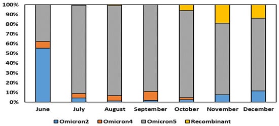 Interestingly, Omicron 5 exhibited a peak in its prevalence in the month of August, where it constituted 92% of the total sequences analyzed. Its presence gradually diminished, although it remained substantial, accounting for approximately 73–75% of the sequences in the months of November and December.