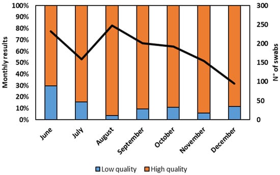 Furthermore, our data showed the possibility of sequencing the variants with second-level high-quality results. More specifically, in June, around one-third of the tests were categorized as low quality, indicating potential inaccuracies. In July, the number of low-quality tests halved. However, considering that the extraction and conservation procedures have not been changed over time, the cause of these fluctuations cannot be determined. After a consistent improvement in the quality results in August, reflecting the effectiveness of testing procedures, from September to the end of the observed period, the standard quality was maintained at a largely unaltered level. These findings highlight the overall reliability of the methodology used, with a consistent majority of high-quality results across the studied period. This evaluation has to take into account that only RNA extracted from the residual buffers of positive RATs was studied, and thus these samples contained a high viral load. Nonetheless, their data ensured reliable results, meaning such samples are appropriate for virus diffusion monitoring.