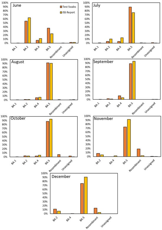 The comparison between our research findings and the data reported by the Italian Institute of Health (ISS) for the period spanning June to December 2022 showed evident similarities in the variants’ distribution. A noteworthy observation that emerged from our study was the remarkably close resemblance of the monthly variant distributions observed through viral RNA obtained from the residue of RAT extraction buffer sequencing to those charted by the ISS for Italy (Figure 4). However, as with any dynamic system, subtle deviations occasionally emerged, providing valuable insights into the nuanced behavior of viral variants. In detail, in June, BA.2 was the dominant strain among our samples, accounting for 54.31% compared to the ISS’s 62.98%. However, we noted a substantial presence of BA.5 (37.07%), which exhibited differences from the ISS’s data (23.15%). July saw a notable rise in BA.5 prevalence in both datasets, reaching 89.31% in ours and 75.53% in the ISS’s data. BA.5 continued its dominance in August, comprising 91.94% of our samples and 90.79% according to the ISS. September demonstrated a similar trend, with BA.5 representing 88.56% in our dataset and 94.41% in the ISS’s. October showed a consistent prevalence of BA.5 at 87.50% in our samples and 93.01% according to the ISS, with minor variations in other sub-lineages. November revealed intriguing disparities: while BA.5 was predominant in both datasets, the data showed a difference of around 20% in the diffusion of this variant (72.90% in ours and 91.53% in the ISS’s) due to a substantial presence of recombinant variants in our samples (18.71%) compared to the ISS ones (2.39%). In December, BA.5 remained prominent, accounting for 74.74% in our data and 90.60% in the ISS’s. Additionally, we observed a significant but decreasing proportion of recombinant variants (13.68%), diverging notably from the ISS’s 3.00%.