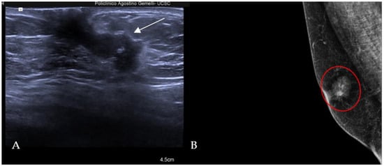 A 60-year-old man with gynecomastia presenting a retroareolar lump on the right breast with nipple retraction and without nipple discharge. Histological examination revealed an invasive ductal carcinoma (ER + 90%, PR + 60%, HER2 score 1+). Ultrasound examination (A) shows a hypoechoic irregular mass (white arrow) in the retroareolar region, with lobulated margins. A mammography (B) shows an irregular hyperdense retroareolar mass with lobulated margins (red circle).