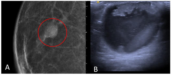 IDC typically originates from the terminal duct–lobular unit [28,29]. Clinical features include a palpable unilateral retroareolar mass with nipple retraction and skin thickening [28,29]. Around 25% of cases may present with bloody nipple discharge [28]. IDC can be associated with ductal in situ components in up to 50% of cases [30]. Mammographically, IDC appears as a retroareolar irregular high-density mass with spiculated or micro-lobulated margins [30,31]. Unlike in women, IDC in men is rarely associated with microcalcifications due to the involution of the ductal system caused by the absence of estrogen and progesterone stimulation [28,29]. Ultrasonography reveals solid, hypoechoic, and irregular masses with margins ranging from microlobulated to spiculated [32]. Papillary carcinoma (PC) is the second most common invasive subtype of MBC and has a higher incidence in men compared to women [33]. PC is characterized by neoplastic proliferation of cells with fibrovascular stalks lacking an intact myoepithelial cell layer [34]. It typically presents with bloody nipple discharge and occurs in the subareolar region. Mammographically, PC may exhibit well-circumscribed or spiculated margins, while ultrasound imaging may reveal a dilated duct or cyst, often appearing as a complex cyst with solid papillary projections along the cyst wall [35,36] (Figure 8).