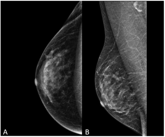 Mammography in cranio-caudal (A) and medio-lateral oblique (B) views in a 52-year-old transgender woman after 5 years of hormone therapy.