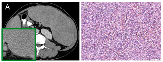 Lymphomatous splenomegaly in a 61-year-old man. (A) Axial contrast-enhanced CT reveals diffuse homogeneous splenomegaly. (B) Hematoxylin–eosin (H-E) photomicrograph shows diffuse red pulp infiltrates of monomorphic medium-sized lymphoid cells. It is morphologically compatible with splenic diffuse red pulp small B-cell lymphoma.