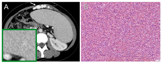All selected patients received splenectomy with a definite pathological diagnosis as reference standard. We analyzed the pretreatment imaging and histopathological data of the included patients. Histological subtyping was performed according to the World Health Organization (WHO) classification system version 5, updated in 2022 [36]. The selected patients were divided into two groups and were categorized based on the histological criteria of lymphoma versus benign groups. Representative examples of the CT images and pathological photomicrographs are shown in Figure 3 and Figure 4. Radiomics results were not available to the assessors of the reference standard.