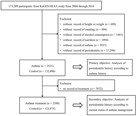 Out of the 173,209 participants, those lacking records of height or weight (n = 698), smoking history (n = 494), alcohol consumption (n = 1463), nutrition (n = 1994), asthma (n = 5973), or periodontitis (n = 27,296) were excluded. Numerous participants were excluded due to the absence of a history of asthma and periodontitis; asthma was not surveyed in 2004, and periodontitis was not surveyed from 2004 to 2006. Eventually, 2521 participants with asthma and 132,806 controls (with non-asthma history) were chosen (Figure 1). Subsequently, we compared the history of periodontitis between the asthmatic and control participants (primary objective). Next, we examined the history of periodontitis according to the current status of asthma management (secondary objective). Of the participants, 7072 were excluded because of a lack of treatment records, since they had not been surveyed in 2008.