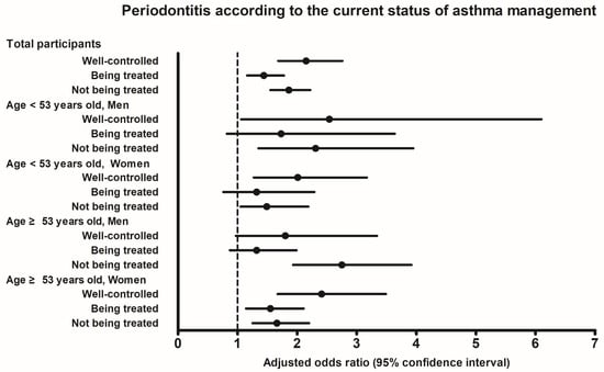 Adjusted odds ratios and 95% confidence interval for periodontitis according to the current status of asthma management.