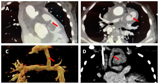 In this context, Nagiub M. and colleagues presented their single-centre retrospective experience of pediatric patients with CHD and diagnosis of IE in which they described a high proportion of right-ventricular pulmonary artery (RV-PA) conduit involvement (Figure 3) as well as IE of the aortic valve. CCT also demonstrated thromboembolism, pseudoaneurysms, prosthetic valve perforations, and prosthetic valve leaks [6,54]. Furthermore, they discussed more peripheral, multi-site imaging to assess for vegetations and emboli (present in around 20–50% of the cases) [20].