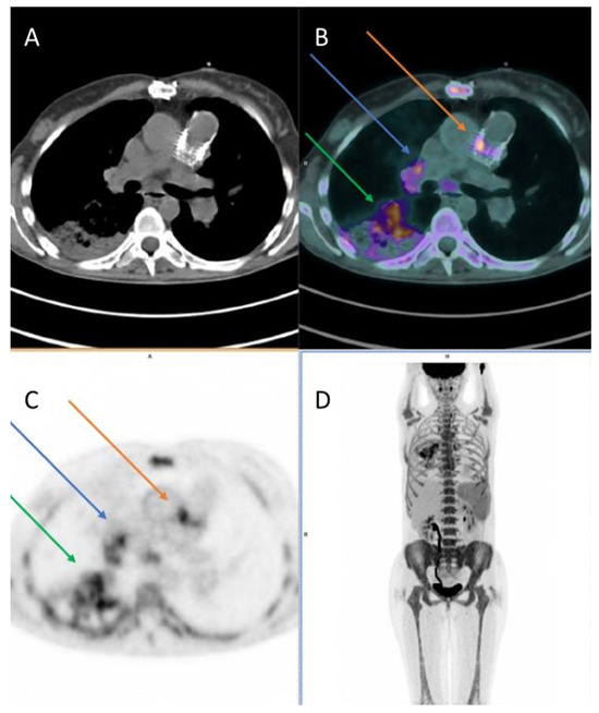A case of pulmonary valve/valve duct endocarditis of a 38-year-old female patient (surgically treated for Fallot tetralogy in 1988 and 2012), evaluated with 18F-fluorodeoxyglucose (18F-FDG) positron emission tomography/computed tomography (PET/CT): axial CT, PET/CT, and PET images (A–C) and maximum intensity projection (MIP) image (D) show hypermetabolism in the pulmonary valve prosthesis and in the valve duct (orange arrows), with extension to aortic wall (demonstrating a disease involvement in the aorta as well). Moreover, the images depict multiple reactive hylo-mediastinal lymph-nodes with high uptake of the radiopharmaceutical (blue arrows) and hypermetabolism in an area of consolidation in the right lung (manifestation of pneumonia, green arrows). In addition, image D shows high uptake of 18F-FDG in spleen and bone marrow, as a sign of systemic inflammatory response.