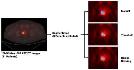 For each patient, image segmentation was performed through both manual and semi-automated methods to extract PCa volumes from PET studies once uploaded to matRadiomics 1.5 [31], a comprehensive radiomics framework that enables the import of biomedical images, the segmentation of the target, the extraction and selection of the radiomics features and the implementation of the predictive model via machine learning algorithms within the same software. Regarding the segmentation task, for the manual approach, an experienced nuclear medicine physicist (C.M. author) manually performed the slice-by-slice delineation. For the semi-automatic approach, we used two semi-automatic segmentation algorithms implemented in matRadiomics 1.5 [31], namely region growing [32,33] and thresholding [34,35]. Specifically, both semi-automatic methods were initialized drawing a Region of Interest (ROI) that surrounds the target and locates the portion of the image that was subsequentially elaborated by the region growing algorithm, based on the “activecontour” MATLAB function [32,33], and the thresholding algorithm [34,35], that uses a percentage of the maximum level of grey in the ROI as a threshold. Since three patients could not be segmented through region growing and thresholding, they were discarded from the total, that decreased from 81 to 78. Figure 1 shows the workflow that led from image visualization to image segmentation. Finally, we compared the obtained binary segmentations using the Jaccard Index [36] given in the equation below with X and Y being sets of segmentations.