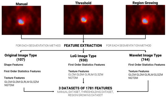 Feature extraction was repeated, for each patient, using the three sets of segmentations (manual, based on region growing and based on thresholding), ending with three datasets of extracted features. A total of 1781 radiomics features were extracted per dataset using the Pyradiomics [37] extractor integrated in the matRadiomics software 1.5. Radiomics features were extracted from the original images (107), from the wavelet decomposed images (744) and from the Laplacian of Gaussian (LoG) filtered images (930), and they could be grouped in three categories: (i) Shape features, based on target morphology, (ii) First Order Statistics Features, based on the distribution of level of grays within the target, and (iii) Texture features based on the pattern of level of grays within the target. Furthermore, Texture features could be grouped in the gray level co-occurrence matrix (GLCM), gray level run length matrix (GLRLM), gray level size zone matrix (GLSZM), neighboring gray tone difference matrix (NGTDM) and the gray level dependence matrix (GLDM) [38,39,40,41,42].