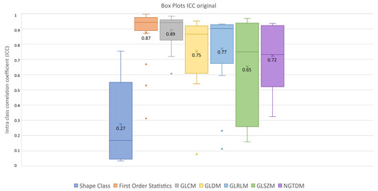 ICC box plots for the original image type. Mean value expressed by the black numbers next to the ‘×’ sign, while the horizontal line is the median.