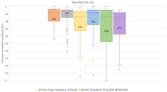ICC box plots for the LoG image type. Mean value expressed by the black numbers next to the ‘×’ sign, while the horizontal line is the median.