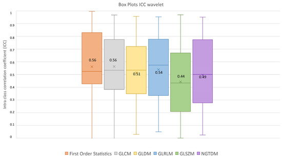 ICC box plots for the wavelet image type. Mean value expressed by the black numbers next to the ‘×’ sign, while the horizontal line is the median.