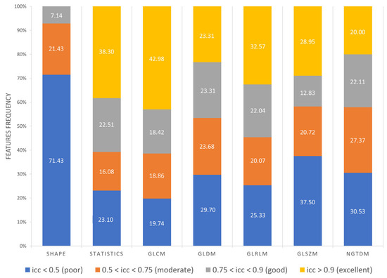- Moderate reproducibility (0.5 < ICC < 0.75) was reached by 18.69% original features, 15.38% LoG features, 26.08% wavelet features.