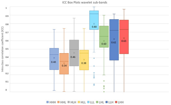 ICC box plots for the wavelet sub-bands (HHH, HHL, HLH, HLL, LLL, LHL, LLH, LHH). Mean value expressed by the black numbers next to the ‘×’ sign, while the horizontal line is the median.