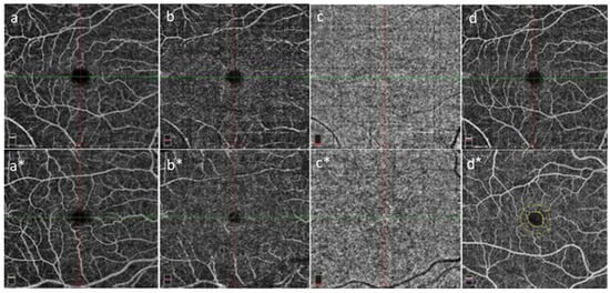 GoutT patients (images with asterisks) and healthy participants (images without asterisks), respectively; superficial capillary plexus (a,a*), deep capillary plexus (b,b*), choriocapillaris (c,c*) and retina (d,d*); OCT-A images are available. It is observed that gout patients (a*,b*) have lower vascular densities in the superficial and deep capillary plexuses compared to healthy participants (a,b).