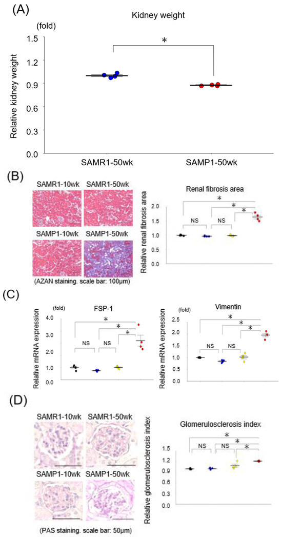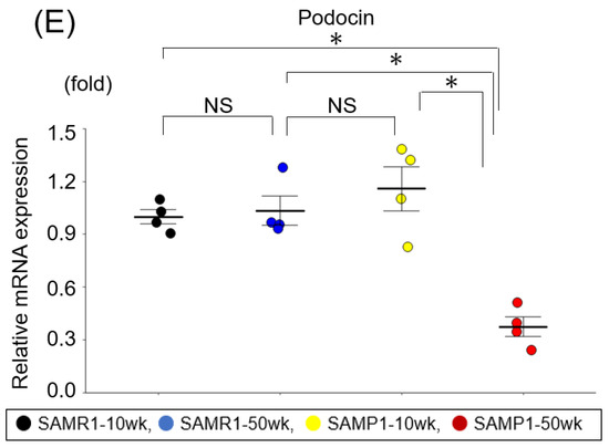 The histological evaluation of the kidney samples revealed that unlike the SAMP1-10wk mice and the SAMR1-10wk and SAMR1-50wk mice, the kidneys from the SAMP1-50wk mice exhibited typical features of fibrosis and glomerulosclerosis (Figure 1B–E). In addition, the qRT-PCR results demonstrated increases in two renal fibrosis markers, i.e., vimentin and FSP-1, in the SAMP1-50wk group (Figure 1C,D) plus a decrease in the expression of podocin (a glomerulosclerosis marker) in these mice (Figure 1E).