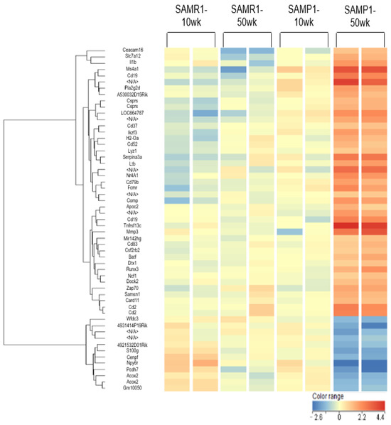 The screening revealed that the expression of 44 of the 62,976 mRNAs was significantly different in the SAMP1-50wk mice compared to the SAMR1-10wk, SAMR1-50wk, and SAMP1-10wk groups through one-way ANOVA. The 44 mRNAs are as follows: 4921532D01Rik, 4931414P19Rik, A530032D15Rik, Acox2, Apoc2, basic leucine zipper ATF like transcription factor (Batf), Card11, Cd19, Cd2, Cd37, Cd52, Cd79b, Cd83, Ceacam16, centromere protein F (Cenpf), Comp, colony stimulating factor 2 receptor, beta 2 (Csf2rb2), component of Sp100-rs (Csprs), Dock2, Dtx1, Fc mu receptor (Fcmr), Gm10050, H2-Oa, IKAROS family zinc finger 3 (Ikzf3), IL-1b, LOC664787, Ltb, lysozyme 1 (Lyz1), mir142 host gene (Mir142hg), MMP3, membrane-spanning four-domains, subfamily A, member 1 (Ms4a1), neutrophil cytosolic factor 1 (Ncf1), Npy6r, Nr4a1, Protocadherin 7 (Pcdh7), phospholipase A2 group IID (Pla2g2d), Runx3, S100 calcium binding protein G (S100g), Samsn1, serine (or cysteine) peptidase inhibitor, clade A, member 3N (Serpina3n), solute carrier family 7 member 12 (Slc7a12), tumor necrosis factor receptor superfamily member 13c (Tnfrsf13c), WAP four-disulfide core domain 3 (Wfdc3), and Zap70 (Table S1, Figure 2).