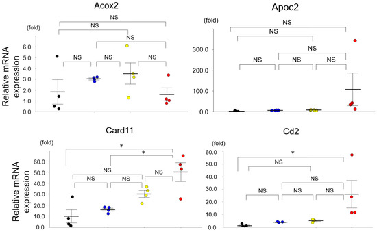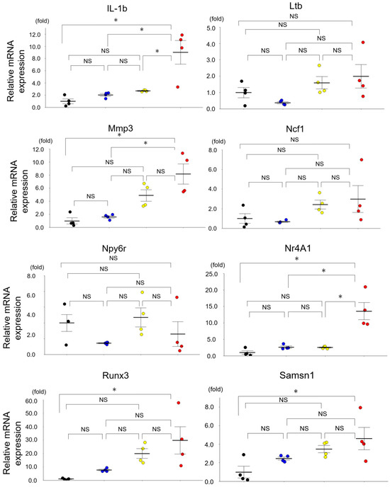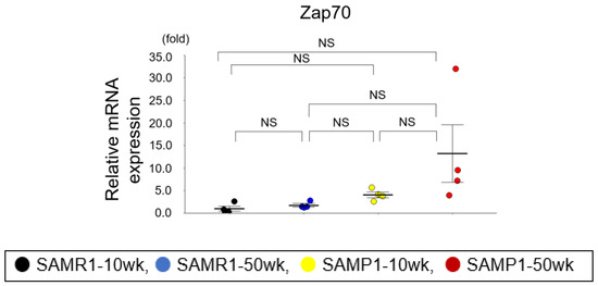 The expressions of mRNAs revealed by a qRT-PCR in the mouse kidneys. The mRNA expressions of Cd37, Comp, Dtx1, IL-1b, and Nr4a1 in the SAMP1-50wk mice were upregulated compared to those in the SAMR1-10wk, SAMR1-50wk, and SAMP1-10wk mice (each group, n = 4). Values are mean ± SE (error bars). * p < 0.05, ANOVA, Tukey’s test. Acox2: acyl-Coenzyme A oxidase 2, branched chain; Apoc2: apolipoprotein C-II; Card11: caspase recruitment domain family, member 11; Comp: cartilage oligomeric matrix protein; Dock2: dedicator of cyto-kinesis 2; Dtx1: deltex 1; IL-1b: interleukin-1b; Ltb: lymphotoxin b; MMP3: matrix metallopeptidase3; Ncf1: neutrophil cytosolic factor 1; Npy6r: neuropeptide Y receptor Y6; Nr4a1: nuclear receptor subfamily 4, group A, member 1; Runx3: runt-related transcription factor 3; Samsn1: SAM domain, SH3 domain and nuclear localization signals, 1; Zap70: zeta-chain-associated protein kinase. NS, not significant.